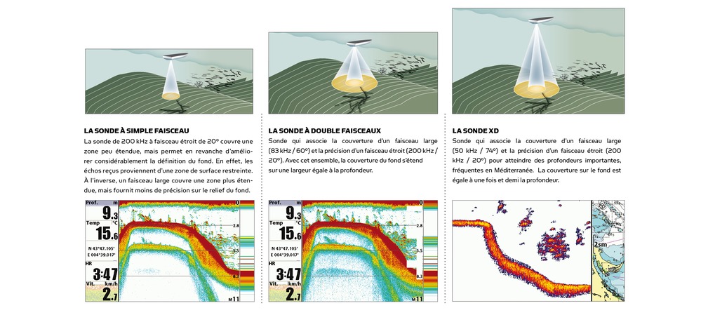 - 200 kHz, angle de 20° pour avoir une idée précise du relief du fond de 0 à 100 mètres