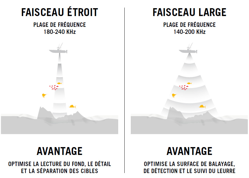 Grâce au faisceau large 140-200khz ne perdez plus votre leurre des yeux et localisez rapidement le poisson, le faisceau étroit qui fonctionne en 180-240khz vous permet quand à lui d‘optimiser le détail et la lecture du fond. Il est également possible de combiner les deux faisceaux pour tirer le meilleur partie des deux plages de fréquence. Avec ces trois modes d‘affichage révolutionnaires vous pouvez explorer efficacement chaque centimètre de la couche d‘eau.