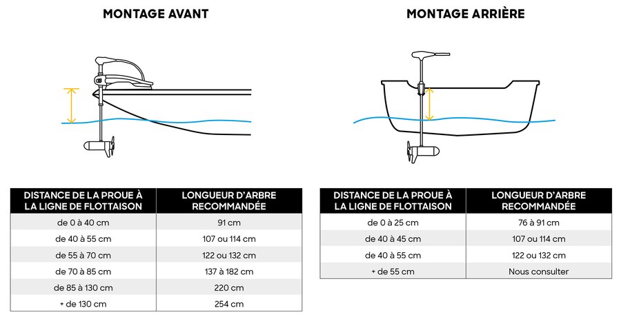 Il est important de choisir la bonne longueur d’arbre ; s’il est trop court, l’hélice ne sera pas suffisamment immergée. Nous vous recommandons d’immerger l’extrémité de l’hélice du moteur d’au moins 30 cm sous la ligne de flottaison. Pour des conditions d'eau plus agitées, un arbre plus long peut être nécessaire.