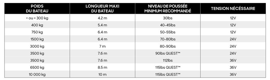 POUR BIEN CHOISIR SON MOTEUR MINN KOTA®, DÉTERMINEZ LA PUISSANCE (NIVEAU DE POUSSÉE ET TENSION) ET LA LONGUEUR D'ARBRE DONT VOUS AVEZ BESOIN.