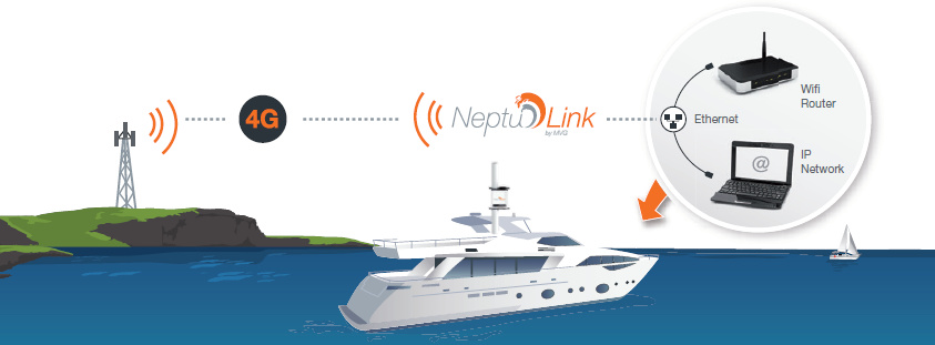 NeptuLink by MVG est conçu pour offrir aux navigateurs côtiers un accès Internet haut débit (100 Mbit/s) jusqu’à 20 milles nautiques.