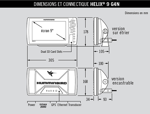 | Fonctions sondeurs | Alarme batteries faibles, Alarme de température, Alarme poissons, Alarme profondeur, Arrêt sur image, Bottom lock, Capture d'écran, Chiffres géants, Données personnalisables, Ecran partagé avec 2 fréquences, Ecran personnalisable, Fenêtre RTS, Filtres bruits, Fish ID, Fish ID+, Historique des données de navigation, ID Structure et Inverse, Lecteur de cartes Navionics, Ligne grise et ligne blanche, Menu X-Press, Simulateur intégré, Température de l'eau, Vitesse de défilement, Vitesse de surface en option, Vitesse fond, Zoom sur le fond |