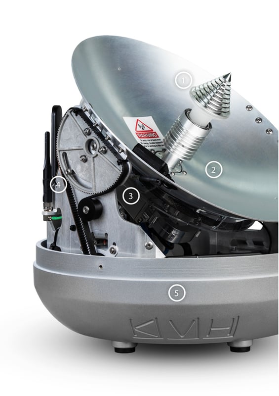 2 - Antenne à ultra-haut rendement utilisant la conception RingFire™ de KVH et une alimentation par tige diélectrique révolutionnaire pour une excellente réception même par mauvais temps.